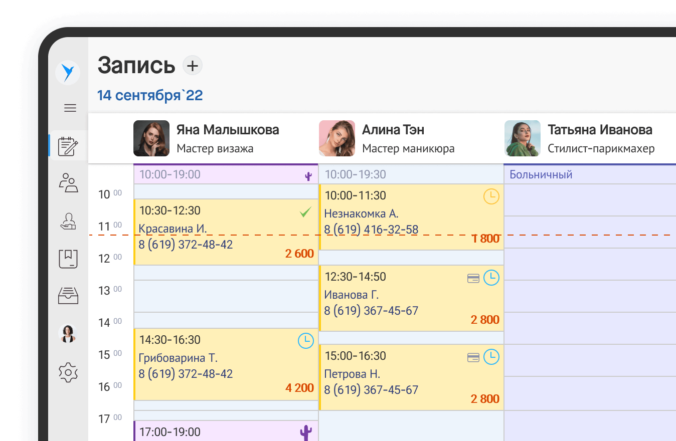 в график врачей или мастеров. Отслеживайте смены, отпуска и больничные в одном окне.