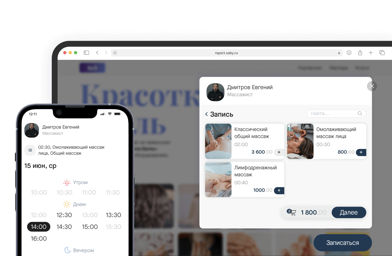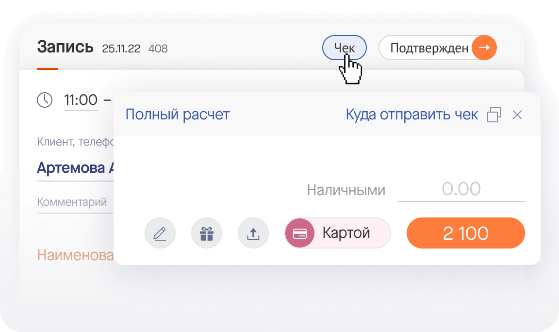 Добавьте виджет на сайт, в соцсети или отправьте ссылку клиенту. Клиент увидит свободные часы, стоимость услуг и доступное время для записи. А также получит подтверждение записи и напоминание перед визитом